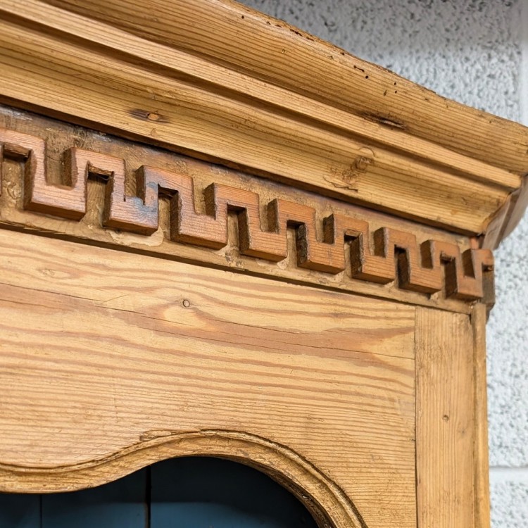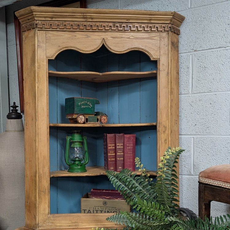 An old Antique Pine corner cupboard with a vibrant blue interior, perfect for display.